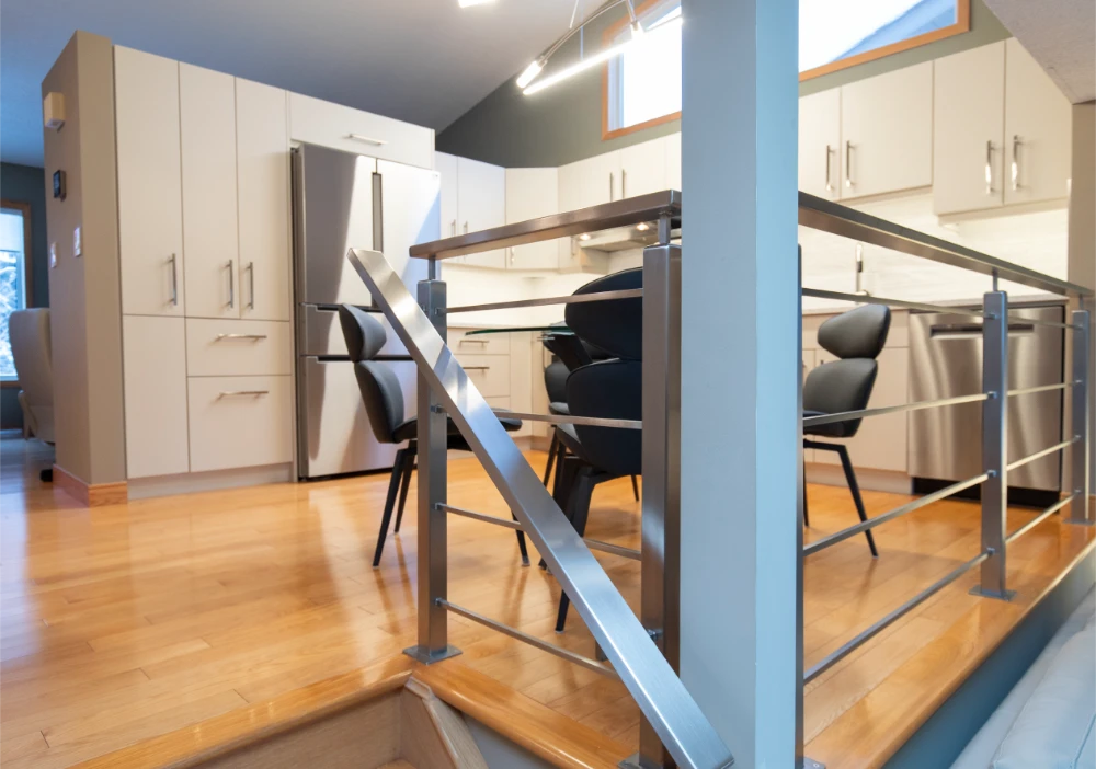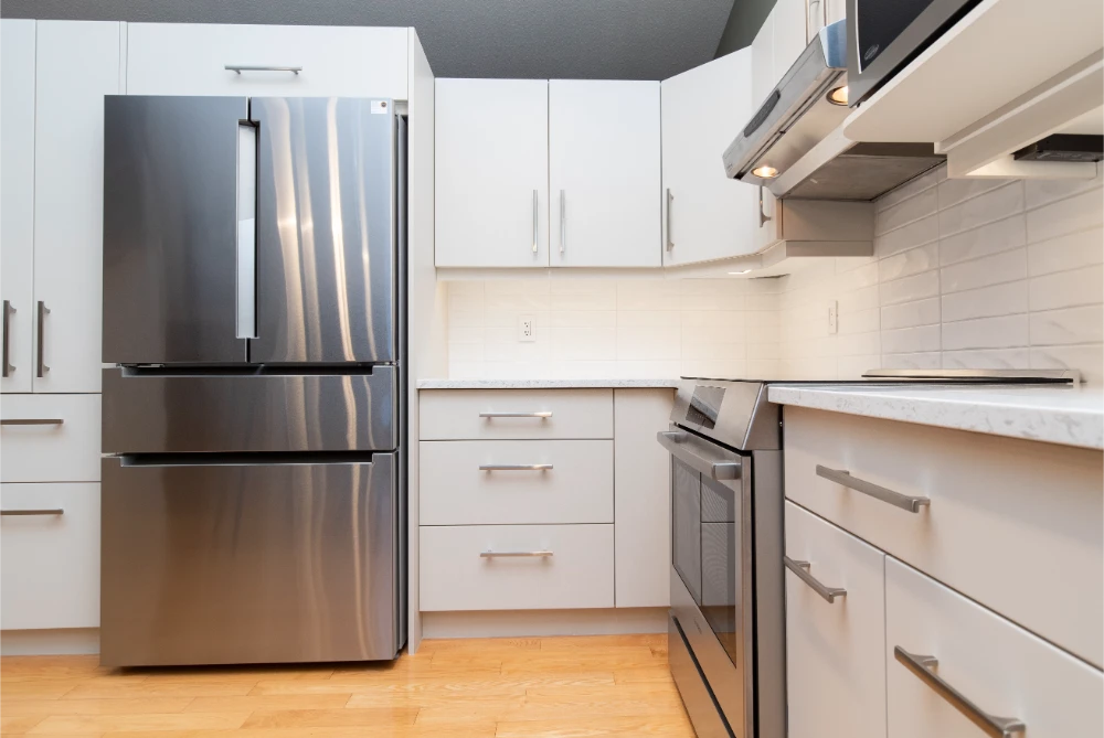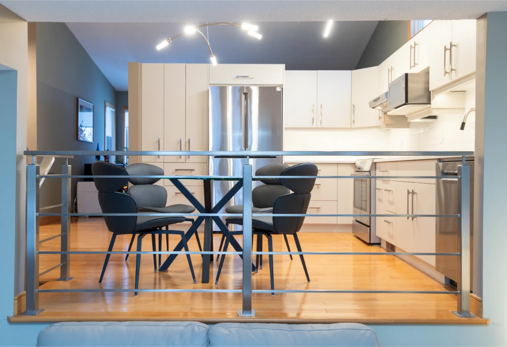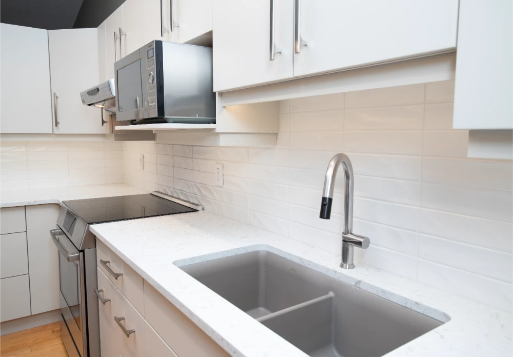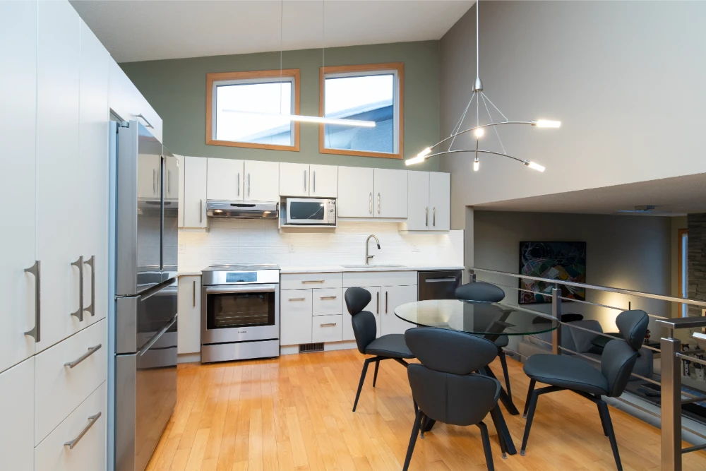 Elevate your home with this beautifully renovated kitchen by Aqua-Tech, where contemporary style meets everyday functionality. This space features sleek, white cabinetry with modern hardware, premium stainless steel appliances, and a spacious layout designed for effortless cooking and entertaining. The striking lighting fixture and expansive windows create a bright, welcoming atmosphere, while the clean lines and high-quality finishes offer timeless appeal. If you’re dreaming of a kitchen that enhances both the look and value of your home, Aqua-Tech’s expert renovation team specializes in creating spaces tailored to your lifestyle and needs. Discover how a custom kitchen renovation can transform your daily living—trust Aqua-Tech, Winnipeg’s leader in home and kitchen renovations.