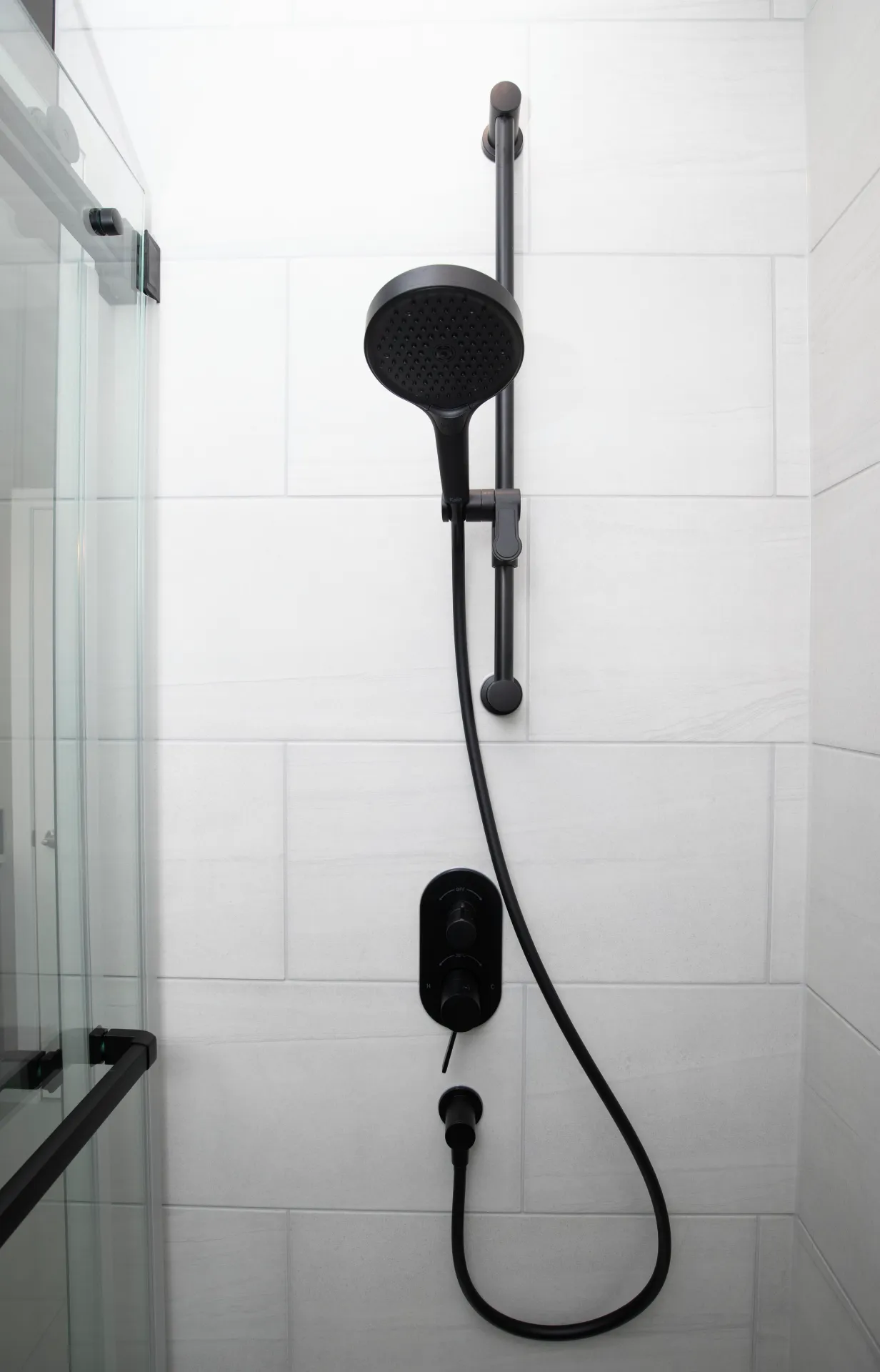 - Frameless glass walk-in shower with sliding door system