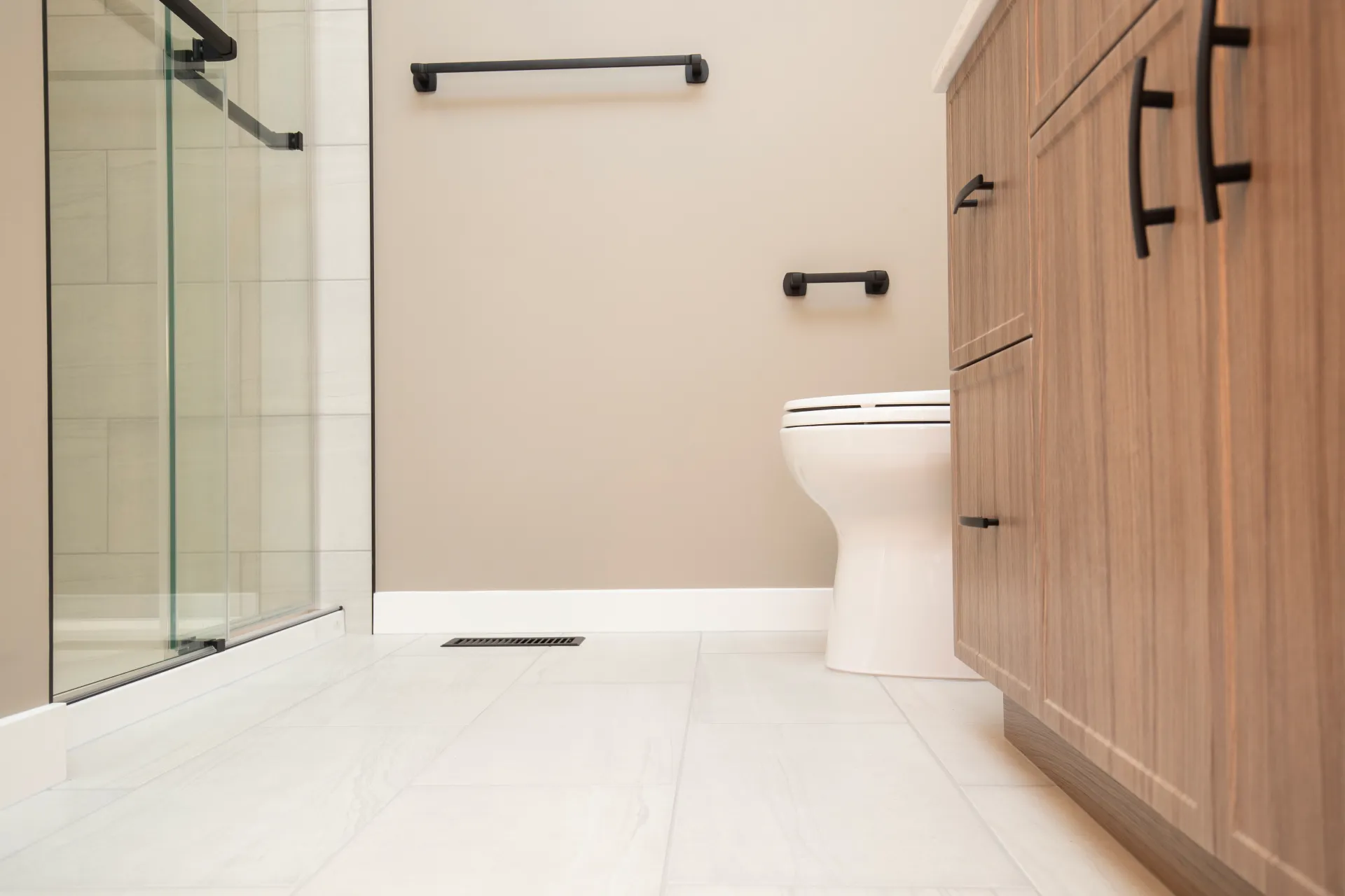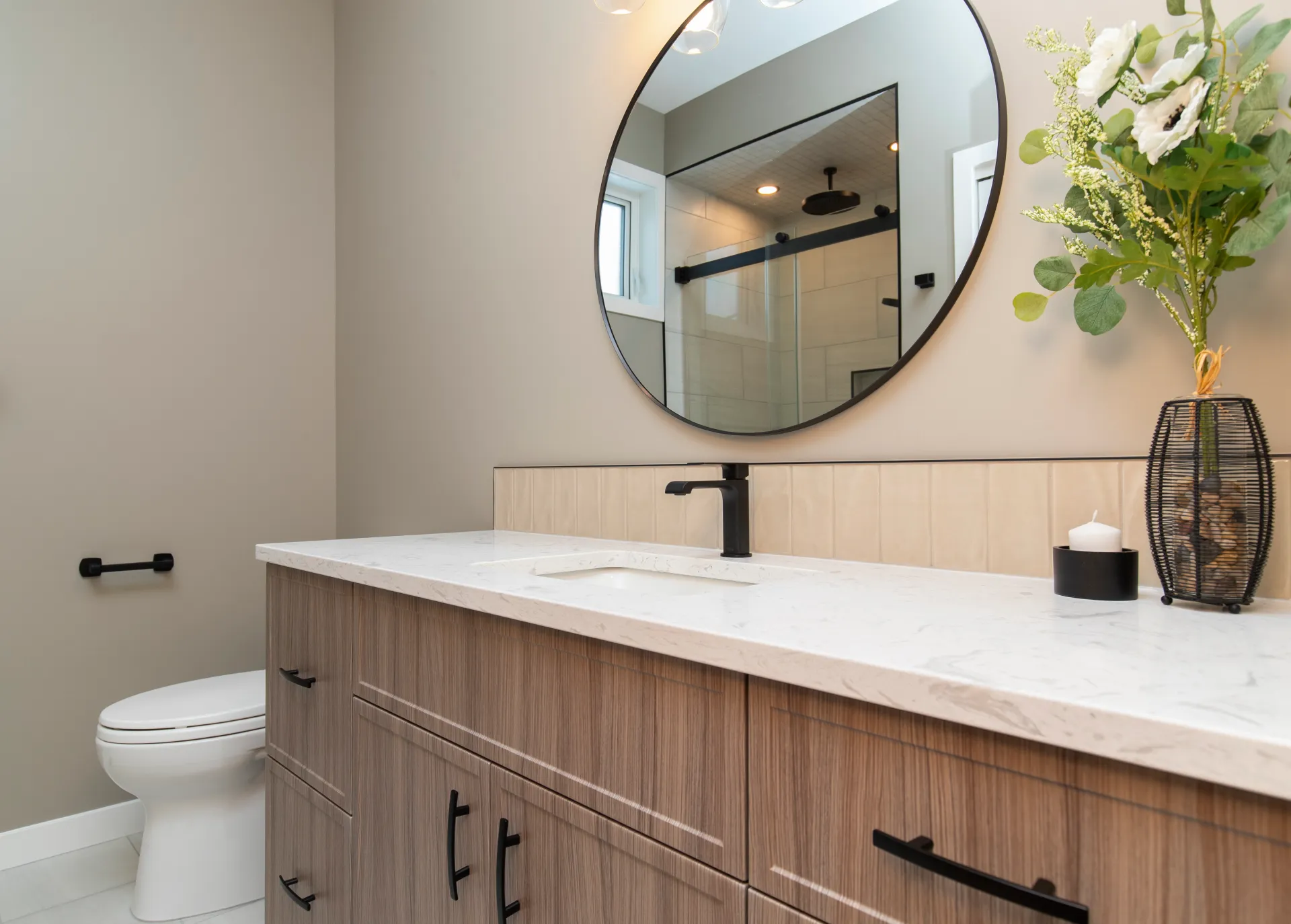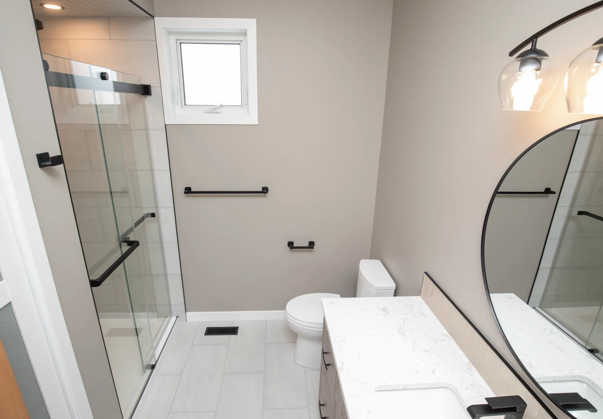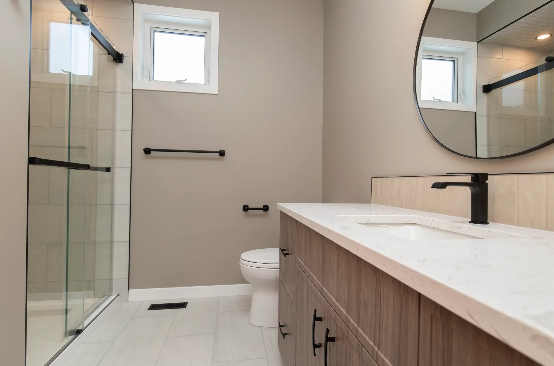 This bathroom renovation in East St. Paul transforms a standard space into a modern, spa-inspired retreat. The project focuses on clean lines, high-quality materials, and thoughtful functionality to enhance everyday comfort. At the center of the design is a spacious walk-in shower with a sleek glass enclosure, complemented by porcelain tile, quartz countertops, and custom cabinetry. The result is a bright, open, and elegant space that delivers the feeling of a private in-home oasis.