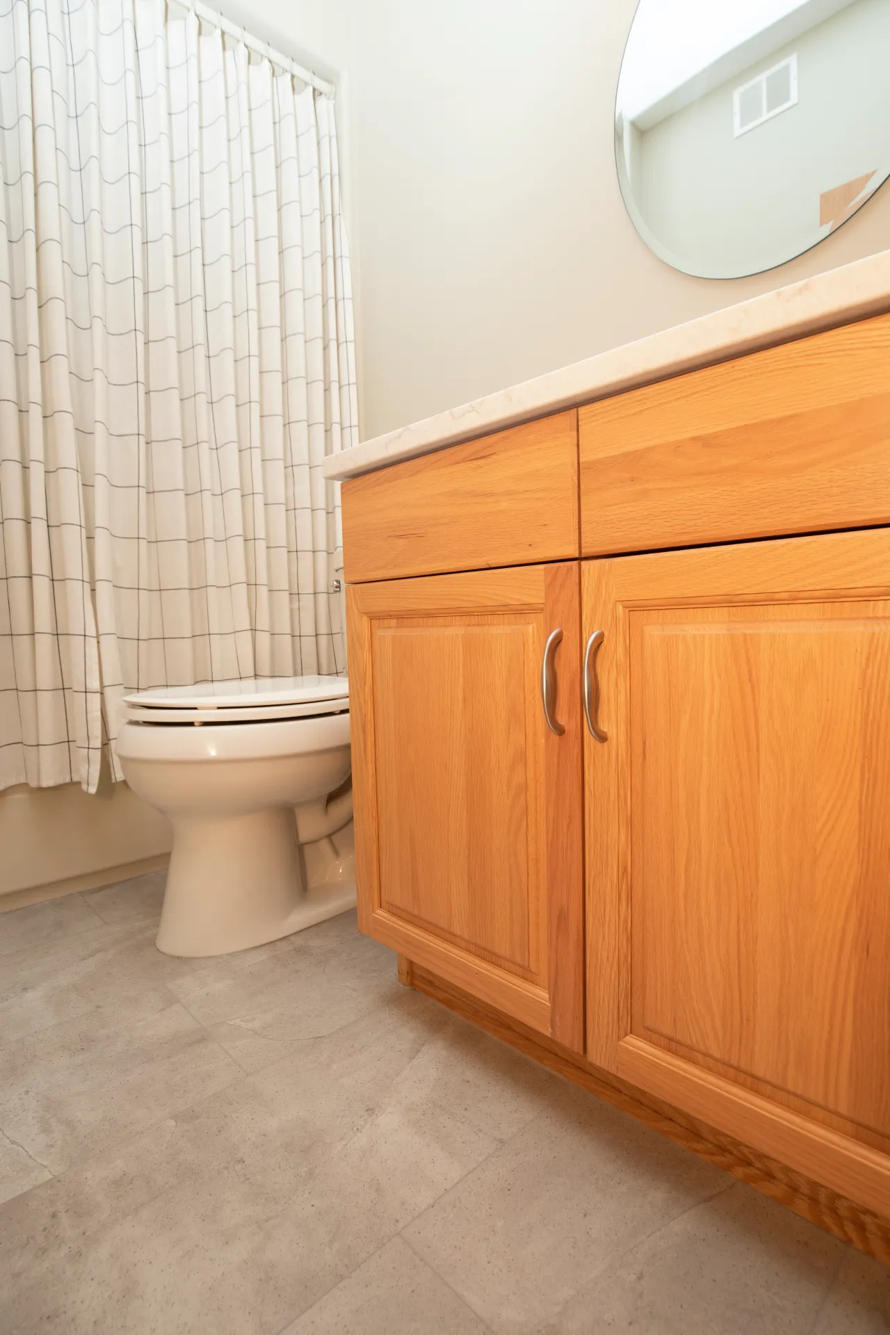 - Seamless porcelain tile throughout