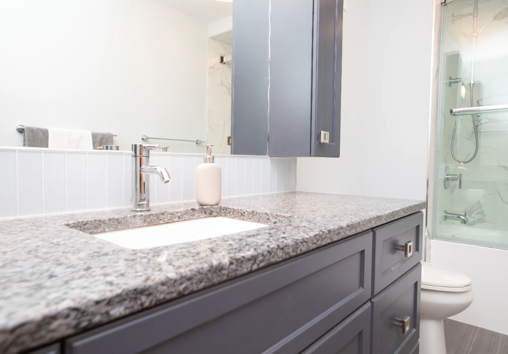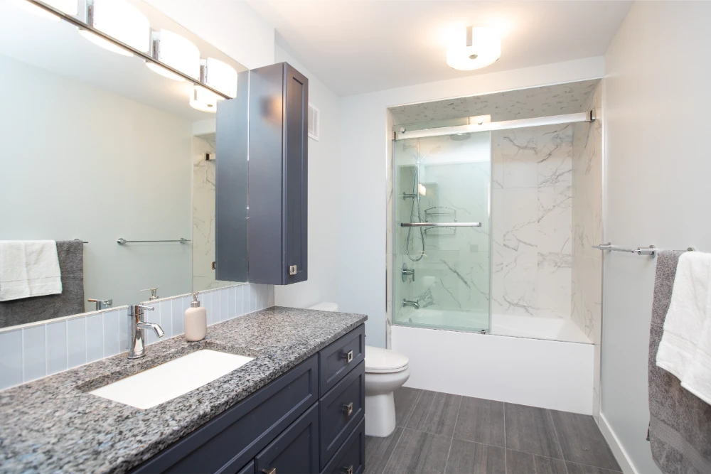 Step into sophistication with this expertly renovated bathroom by Aqua-Tech, featuring a stunning combination of style and practicality. The space showcases a luxurious glass-enclosed tub and shower with elegant marble-look tile, perfectly complemented by a modern vanity with deep navy cabinetry and a beautiful granite countertop. Thoughtful lighting and sleek chrome fixtures add a touch of contemporary flair, while the clean, open layout ensures comfort and efficiency. If you’re seeking a bathroom renovation that blends timeless design with everyday functionality, Aqua-Tech’s experienced team delivers outstanding results tailored to your needs. Transform your home with a bathroom that’s both beautiful and built to last—choose Aqua-Tech, Winnipeg’s trusted renovation specialists.