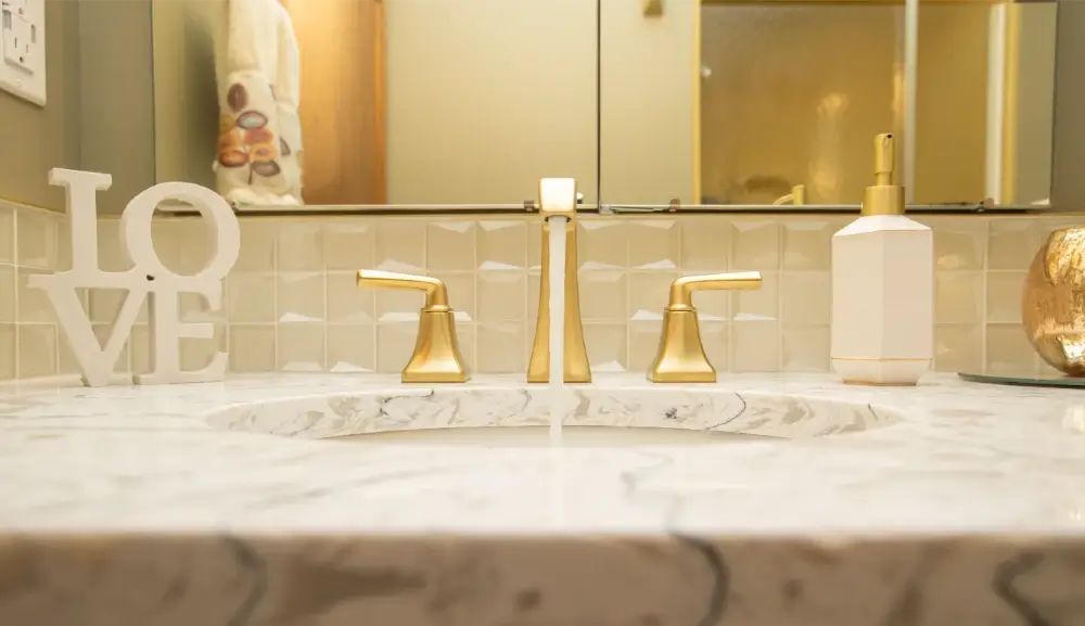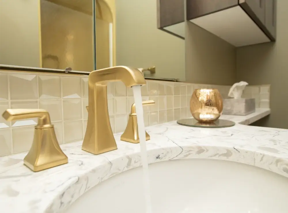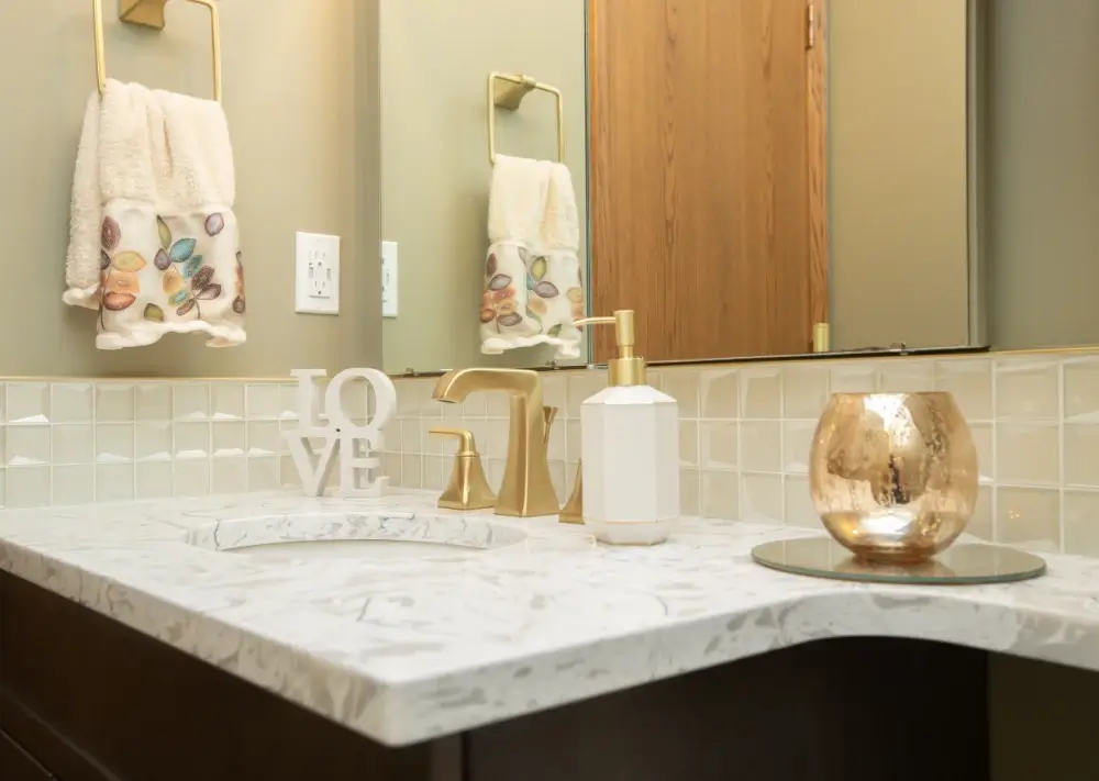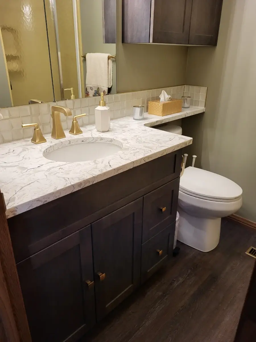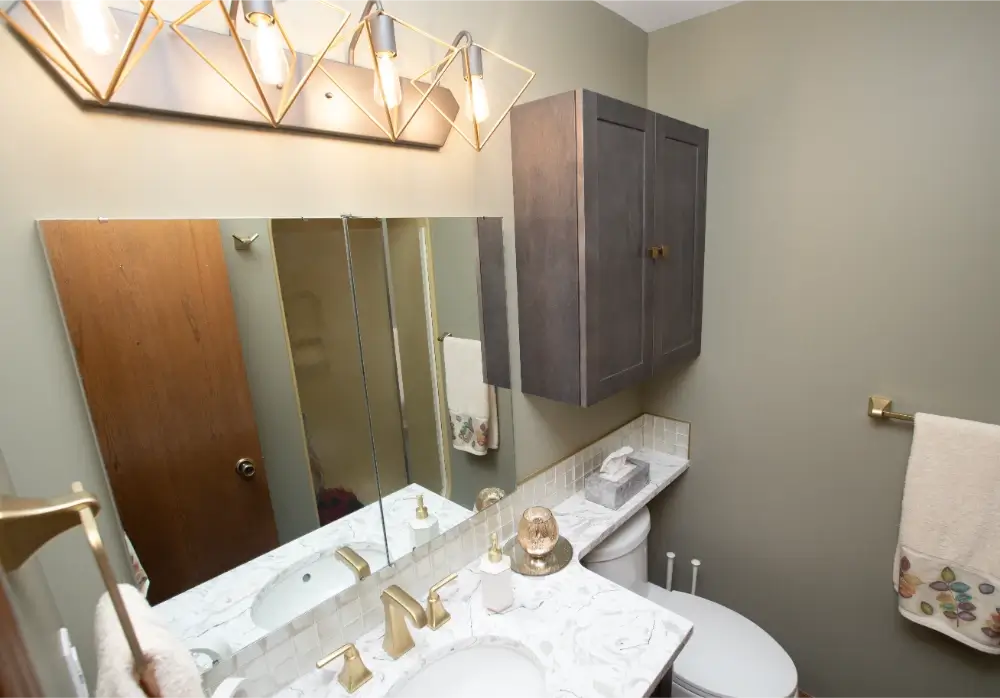 Add a touch of elegance and warmth to your home with this beautifully renovated bathroom by Aqua-Tech. Featuring a sophisticated blend of wood cabinetry, gold hardware, and a striking geometric light fixture, this space exudes modern charm and timeless appeal. The marble-look countertop and matching gold faucet create a luxurious focal point, while the soft lighting and thoughtful details ensure a cozy, inviting atmosphere. If you’re looking to upgrade your bathroom with high-quality finishes and stylish accents, Aqua-Tech’s expert team delivers custom renovations that enhance both beauty and functionality. Discover how a professionally renovated bathroom can elevate your Winnipeg home—choose Aqua-Tech for your next project.
