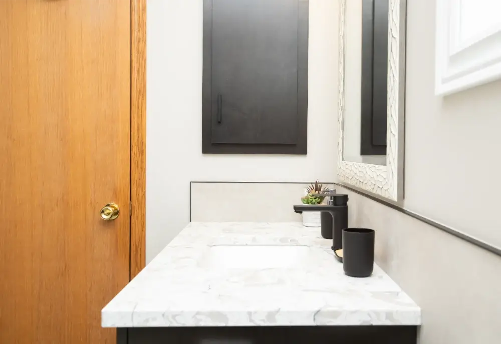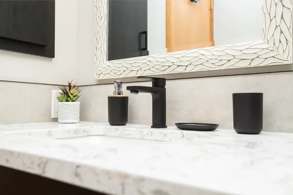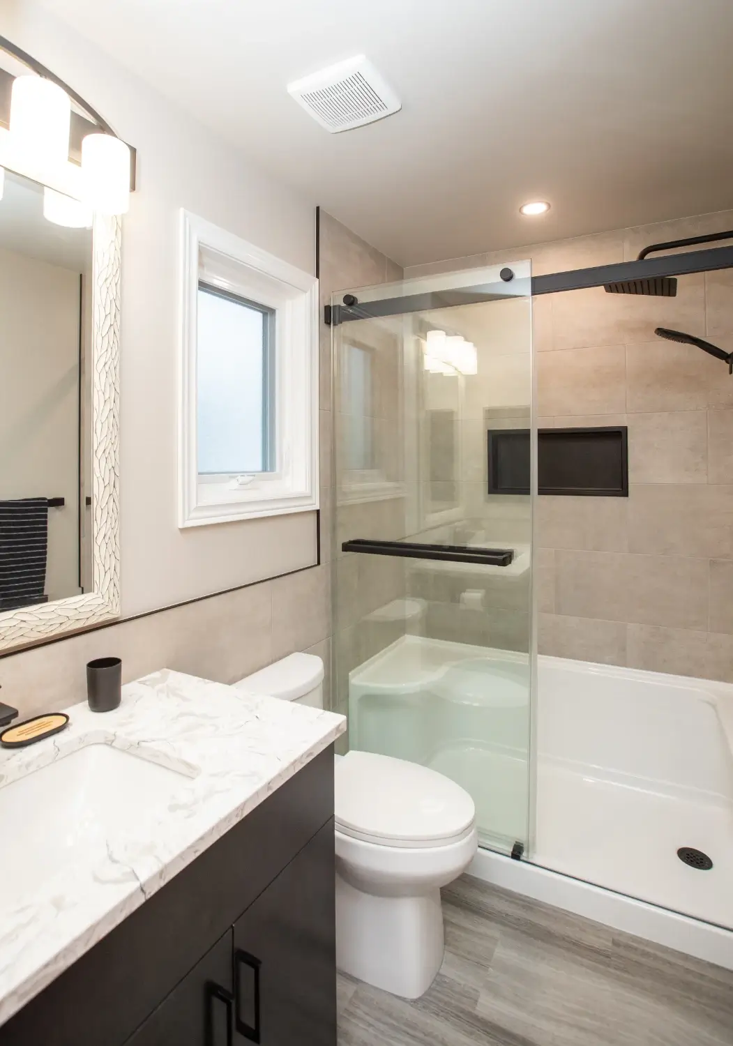 Elevate your home with this sophisticated bathroom renovation by Aqua-Tech, designed for both luxury and practicality. This space features a spacious glass-enclosed tub and shower with sleek matte black fixtures, a modern rainfall showerhead, and a convenient built-in niche for storage. The elegant vanity with a marble-look countertop and contemporary black hardware creates a striking focal point, while the neutral tile and large mirror enhance the room’s sense of space and light. If you’re seeking a bathroom that blends high-end finishes with everyday functionality, Aqua-Tech’s expert team delivers custom renovations to fit your style and needs. Transform your bathroom into a beautiful, easy-to-maintain retreat—trust Aqua-Tech for your Winnipeg home renovation.