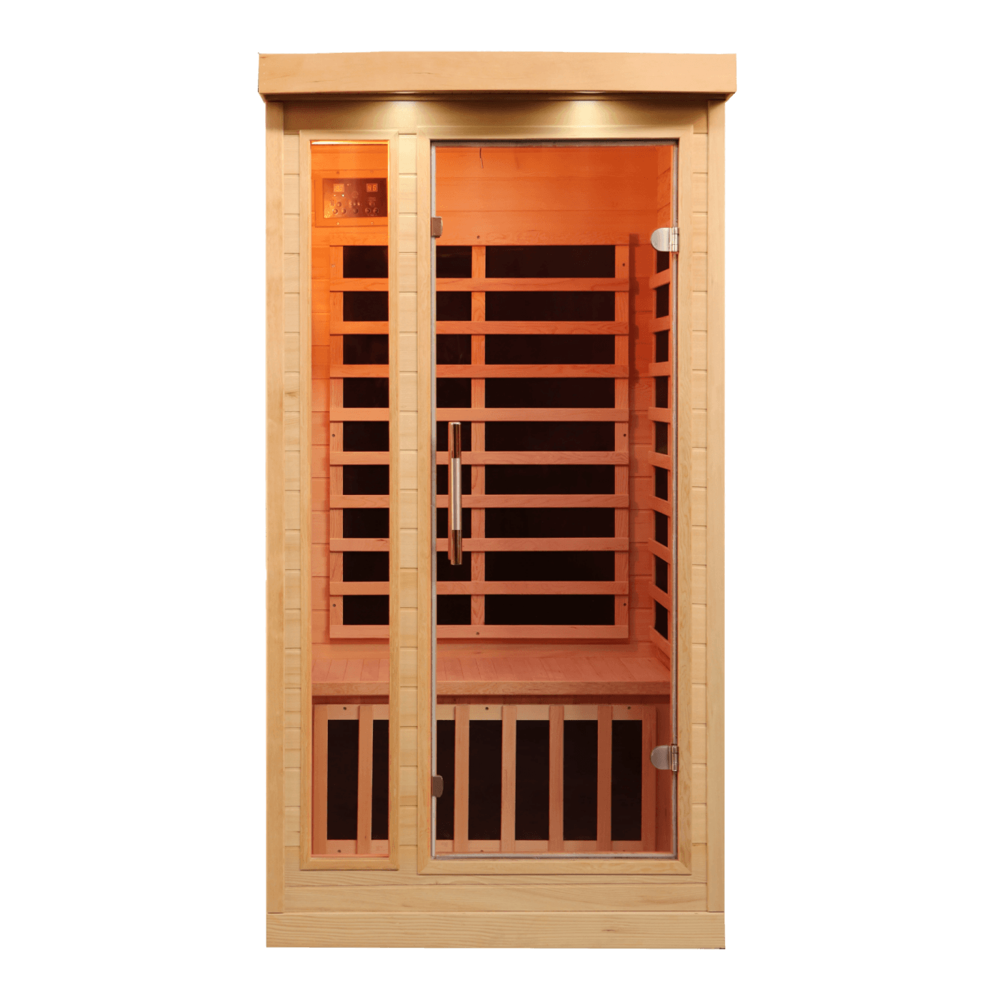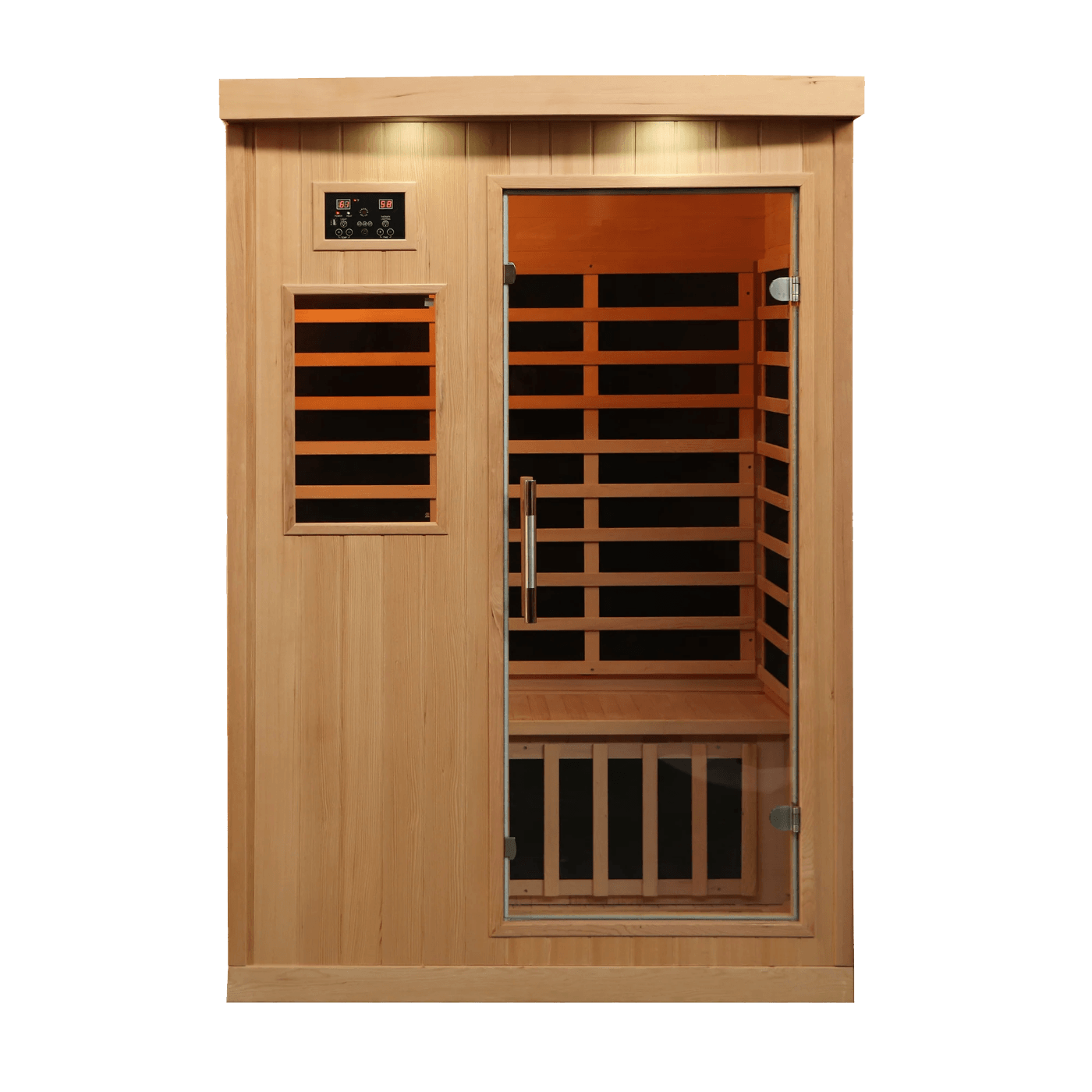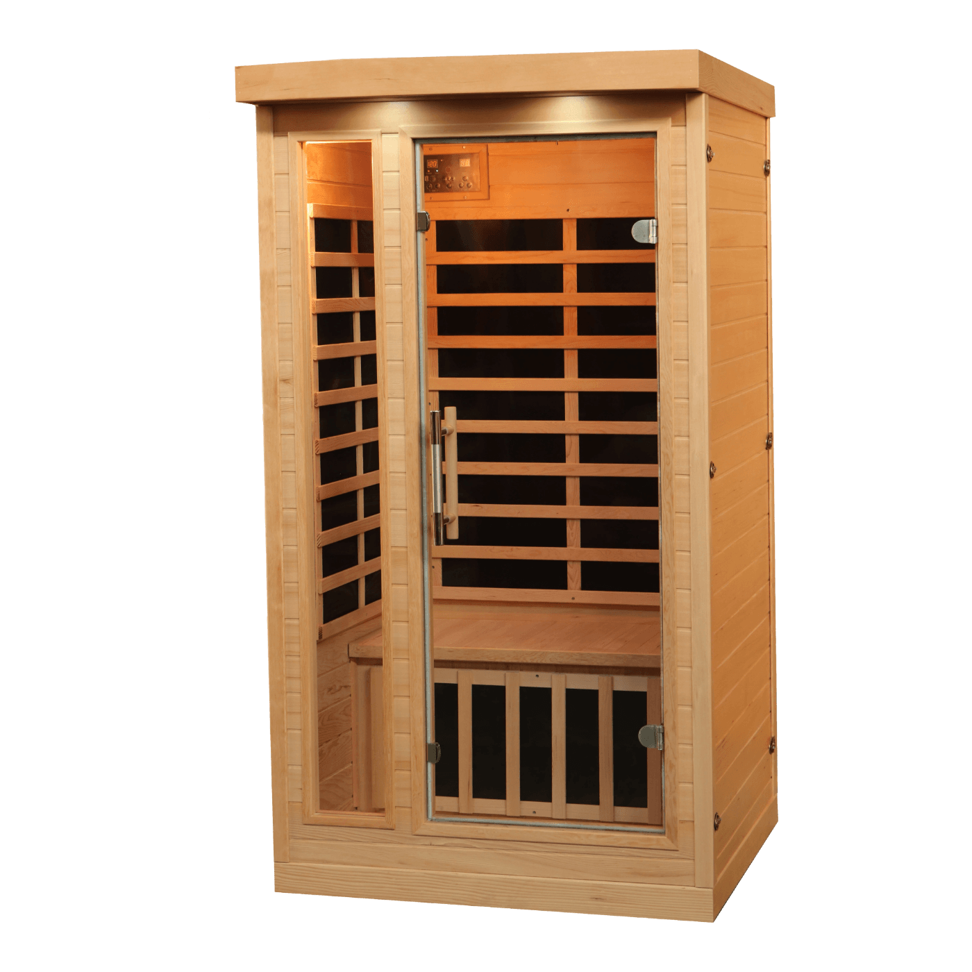 A user-friendly control system boasts advanced features such as a timer, ‘pre-heat’ and ‘auto-start’ options. Features the latest technology with 8 FAR infrared heaters that last 3000 to 5000 hours each. Constructed of an attractive and durable Canadian Hemlock wood, and designed with a locking clasp system that allows for a quick and easy assembly. A built in Bluetooth audio system, LED lighting, and more ensure that you will have the relaxation experience that you are looking for. Tempered safety glass doors and windows add a modern look and allow a clear view of your outside surroundings. Exceeds industry safety expectations with average EMF levels of 1.3mG (42 times lower than competing saunas!) The operating temperature can be set between 67°F – 140°F. Plugs into a standard dedicated outlet 1 year limited warranty, heater/cabinetry .